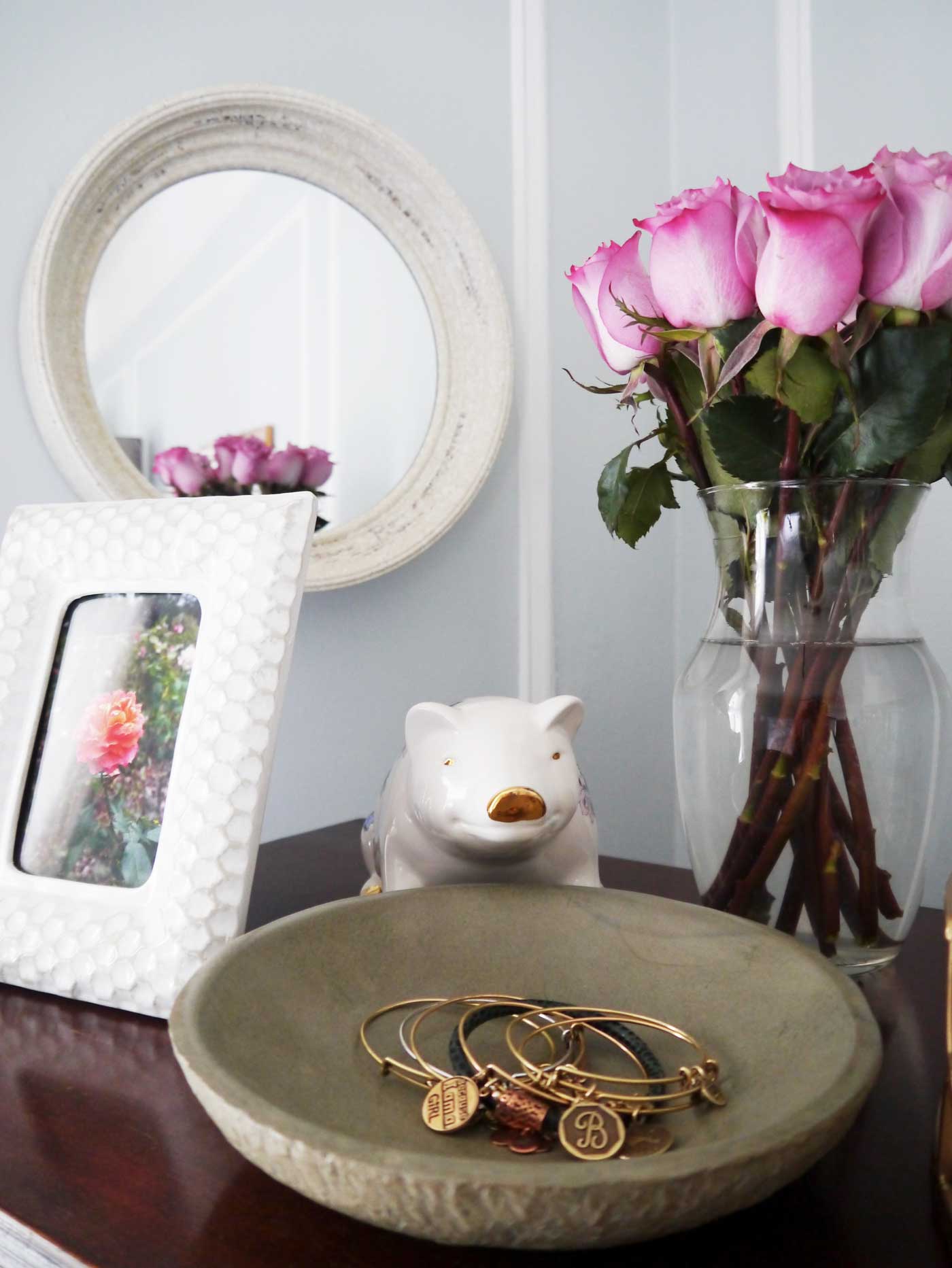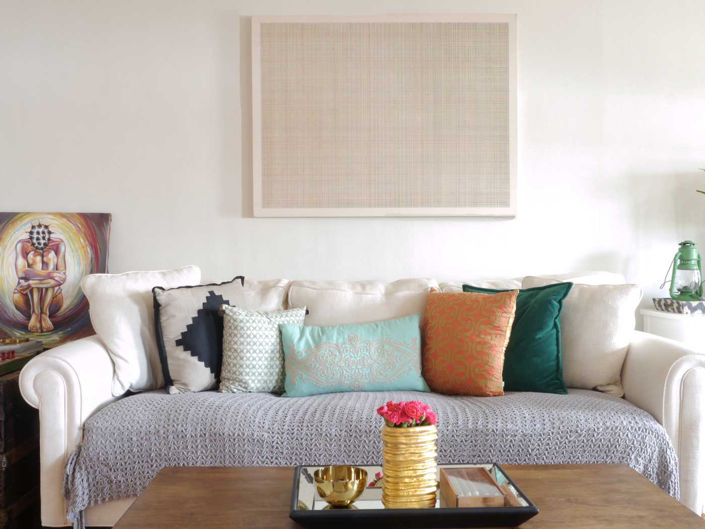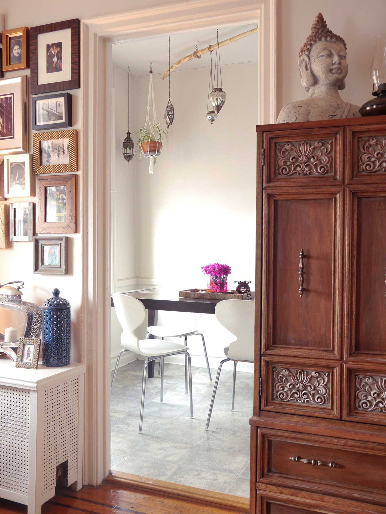 Bright, warm, whimsical. Accents both found and passed down. A grandmother's hanging lamp breathes out light and memory. A salvaged armoire we restored acts as stately art. Pale walls with ivory trims tie it all together. We use a medley of patterns and planters to represent life.